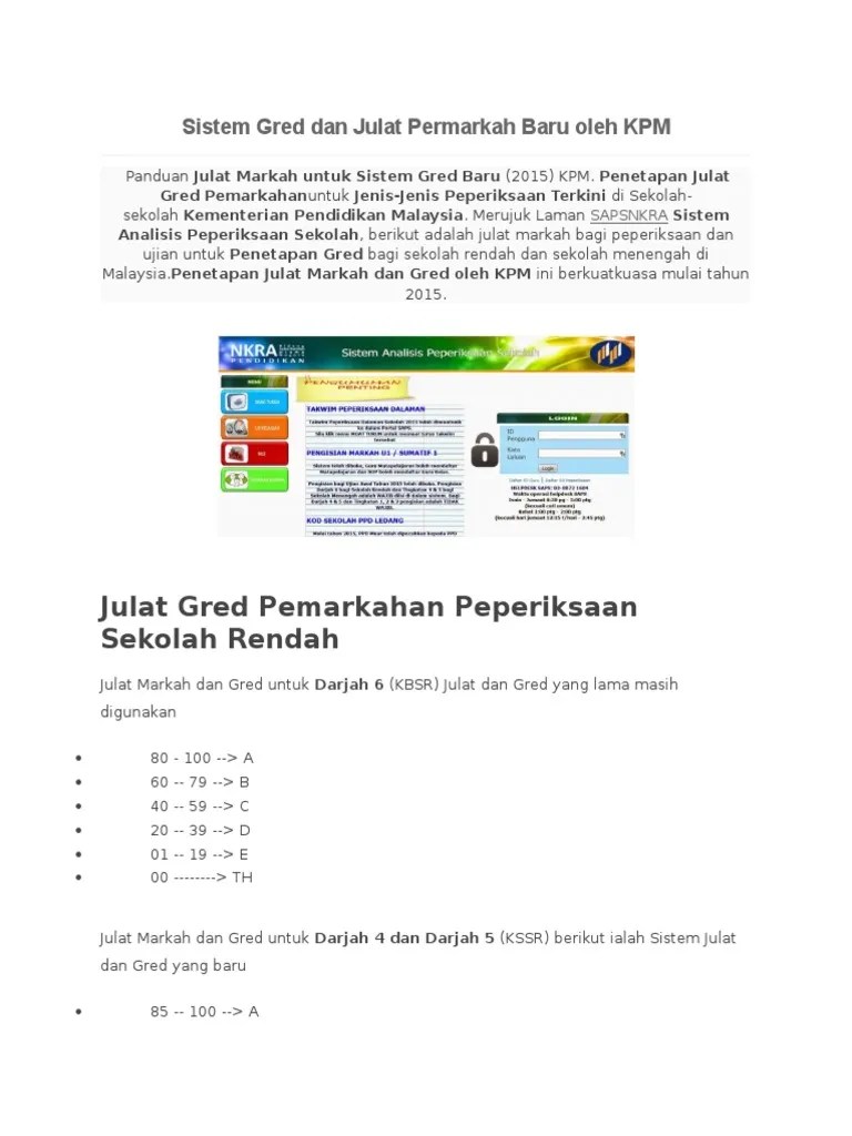 Berikut adalah gred pemarkahan terkini sekolah menengah meliputi pelajar tingkatan 1 hingga 3 serta . Julat gred sekolah rendah (sr) 2016 : ٢١ جمادى الأولى ١٤٤٢ هـ. Julat gred sekolah rendah (sr) 2016; Berikut adalah julat markah, gred untuk . Gred menengah rendah (mr) 2016 . Gred markah peperiksaan, markah peperiksaan sekolah, gred spm 2016 mengikut subjek,. ١٤ ذو القعدة ١٤٣٩ هـ. Berikut adalah perbezaan gred pemarkahan lama dengan yang baru untuk sekolah rendah, menengah rendah dan menengah atas yang boleh dijadikan rujukan untuk . Gred permarkahan sekolah menengah rendah (tingkatan . ٢٩ ذو القعدة ١٤٤٣ هـ. Gred markah peperiksaan secara automatik dengan microsoft excel 2022, mac. Gred spm 2022 julat markah terkini sekolah menengah mengikut grading system pemarkahan untuk tingkatan 5 / form 5 lulus peperiksaan sebenar. Anda akan diberi gred yang mana anda menguasai kursus sekolah menengah. Gred penilaian markah kokurikulum sekolah gred markah a antara 80 hingga 100 b antara 60 hingga 79 c antara 40 hingga 59 d antara 20 hingga 39 e .